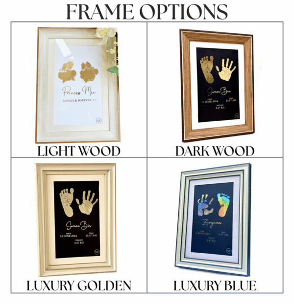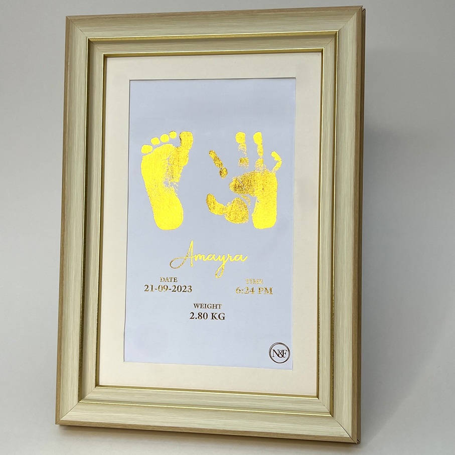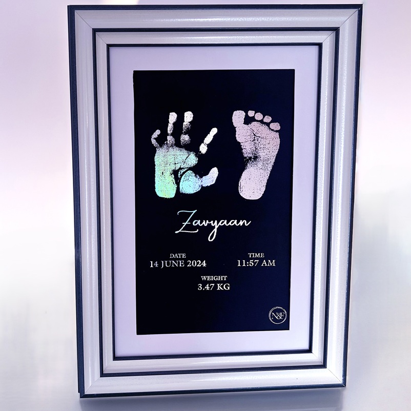 This customised keepsake frame is the perfect personalized gift for new parents, grandparents, friends or as a standout baby shower gift — a sentimental present that will be treasured for generations. Designed to capture attention wherever it is placed, each frame is finished with utmost care so your baby’s tiny memories are preserved – Now & Forever. The print kits are included in the order. It consists of inkless print pad and paper to take the imprint without making any mess or getting on the baby’s skin, making it easy to capture & preserve the memories. It’s completely safe to use for newborns as well.   Keep in mind that the imprints are handmade and uniquely created for each order. Sometimes, there might be slight variations in the way the metallic layers adhere to the surface of the paper, rarely resulting in occasional spots or marks, which give each imprint a unique characteristic, making it one-of-a-kind. Each frame is carefully inspected to ensure the highest quality & best output. What is Included: 1. Inkless Kit